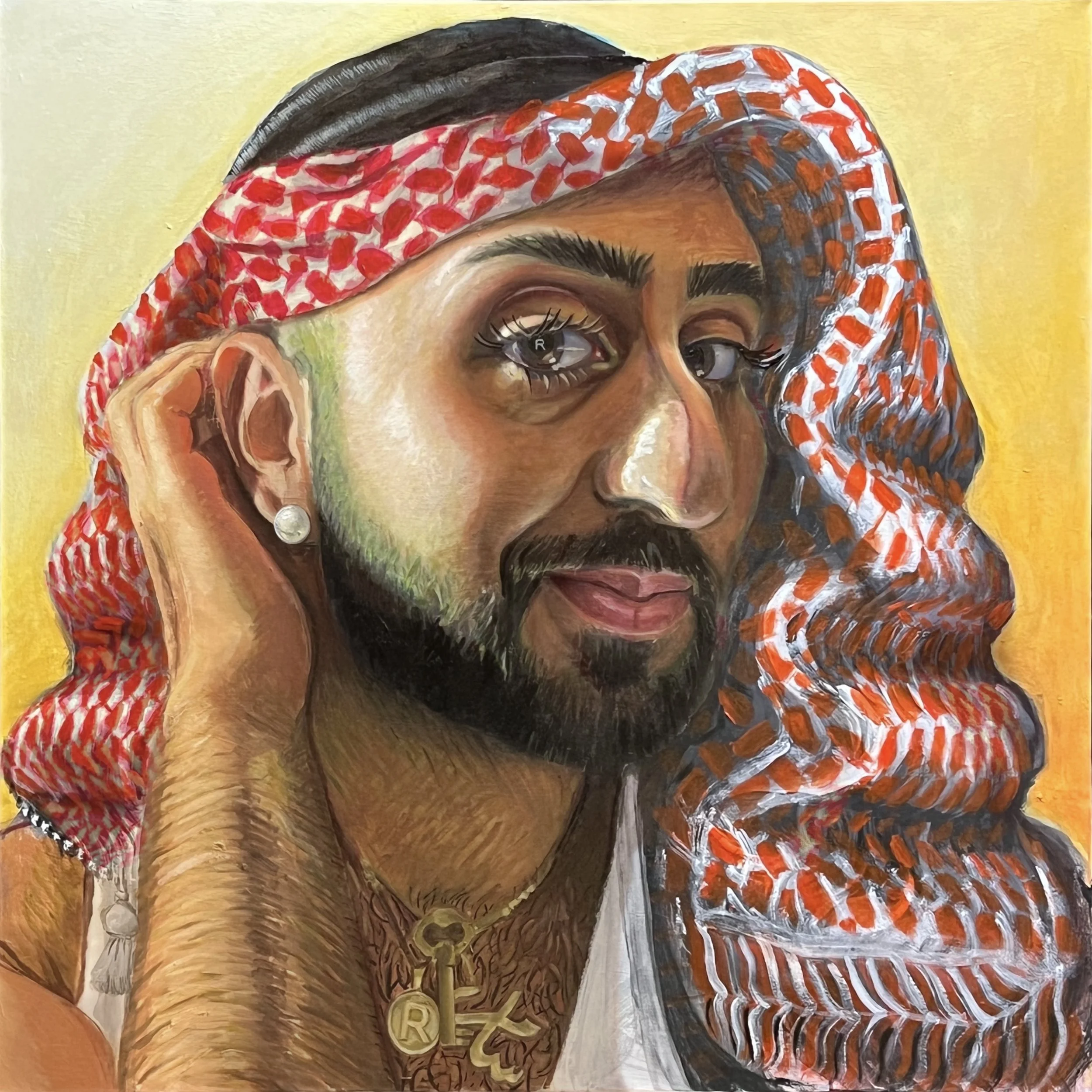 RIDIKKULUZ is a Palestinian-Egyptian-Jordanian multidisciplinary artist based in New York. Their figurative work memorializes family, chosen family, and the self while investigating religious, decolonial, cultural, and queer themes. Ridikkuluz belongs to the ballroom community as a member of the Haus of Telfar.